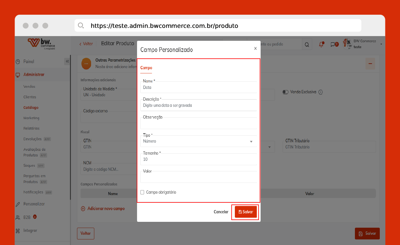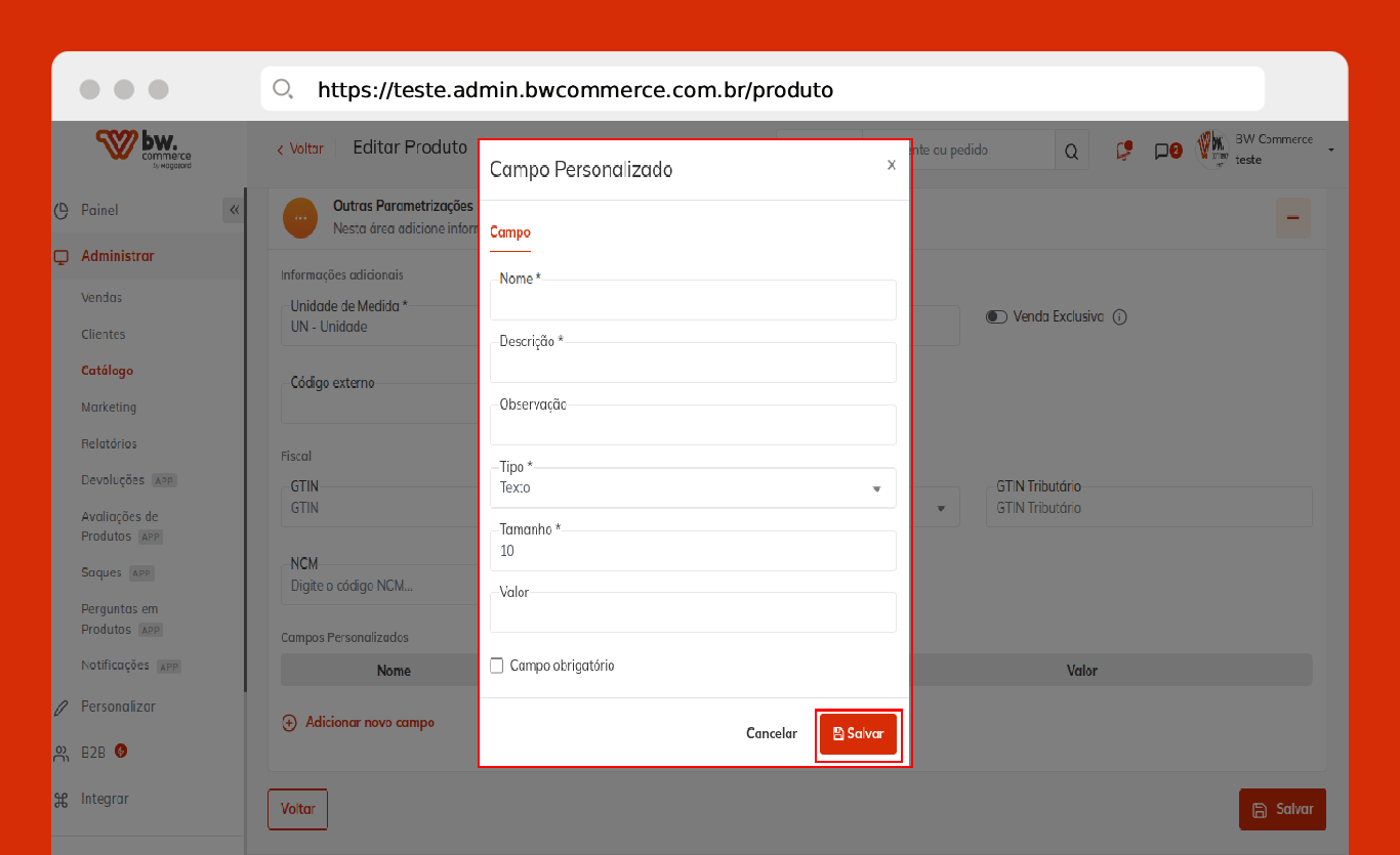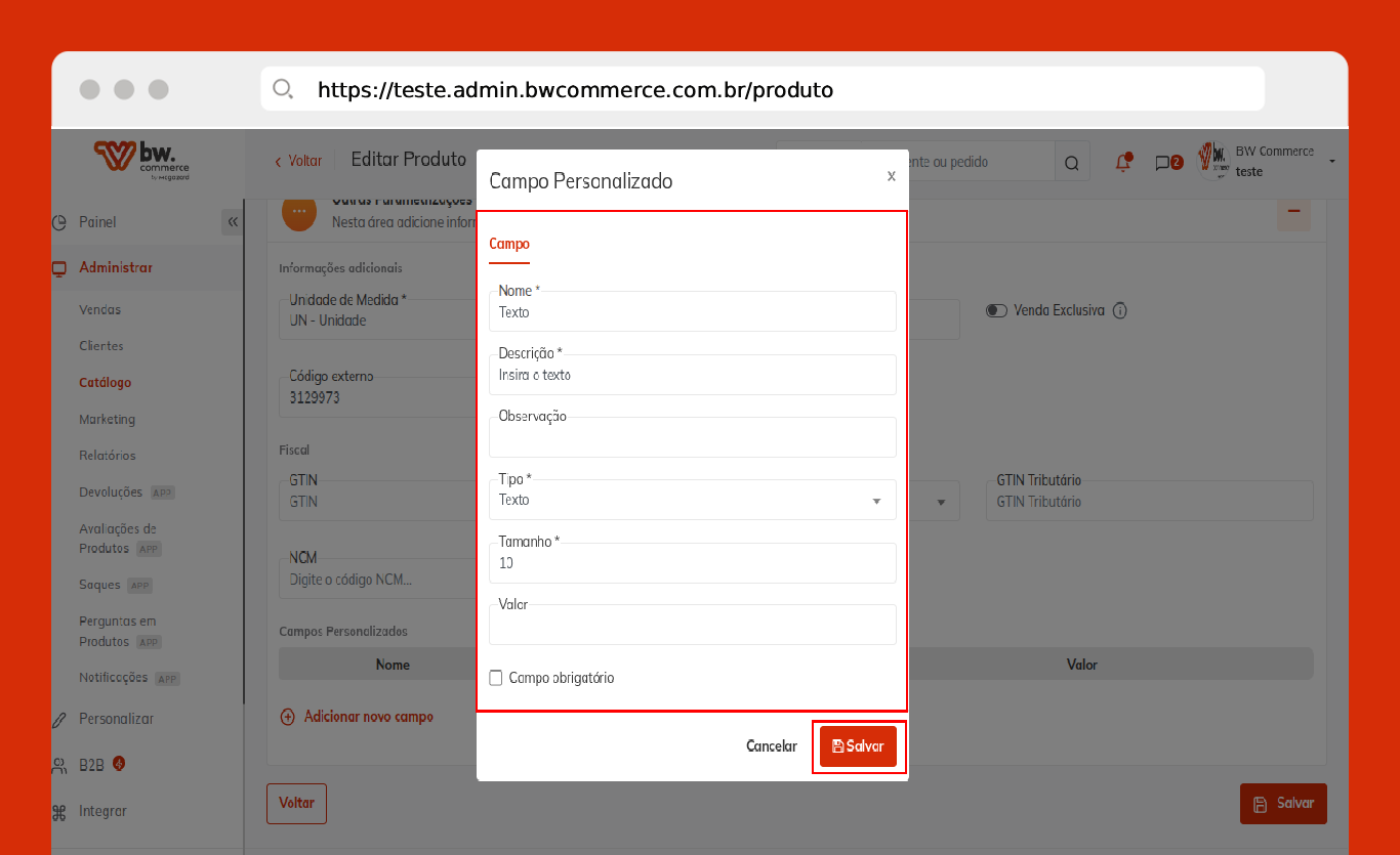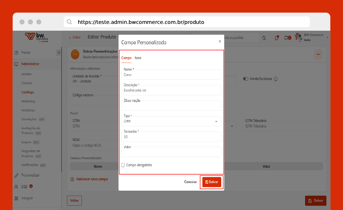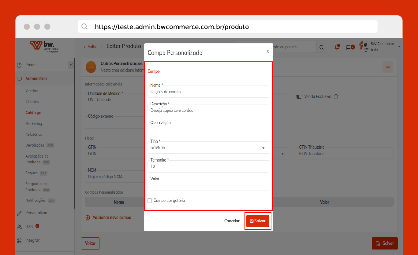 - Campo obrigatório: Marque caso você queira que o cliente seja obrigado a preencher a personalização para adicionar o produto ao carrinho.